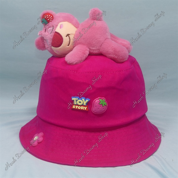 Nón tai bèo vành cụp trẻ em từ 3-5 tuổi hàng Việt Nam, mũ tai bèo gấu dâu vòng đầu 52cm có dây quai phía trước có chữ Toy Story bên trên có gấu dâu vành rộng 6cm