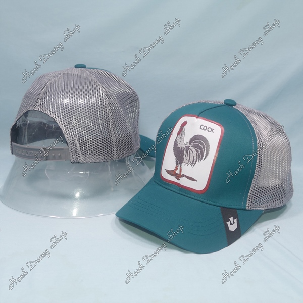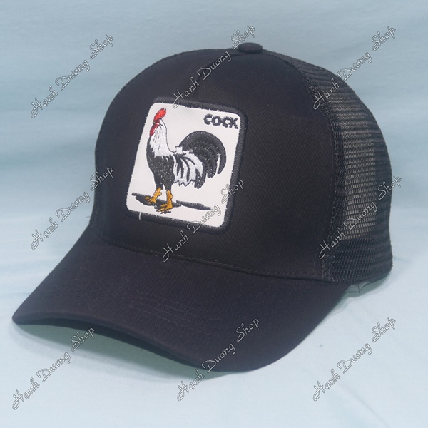 Nón kết lưới in con gà trống in chữ Cock phía sau khóa nhựa phía trong và trước có tem vòng đầu 55-58cm